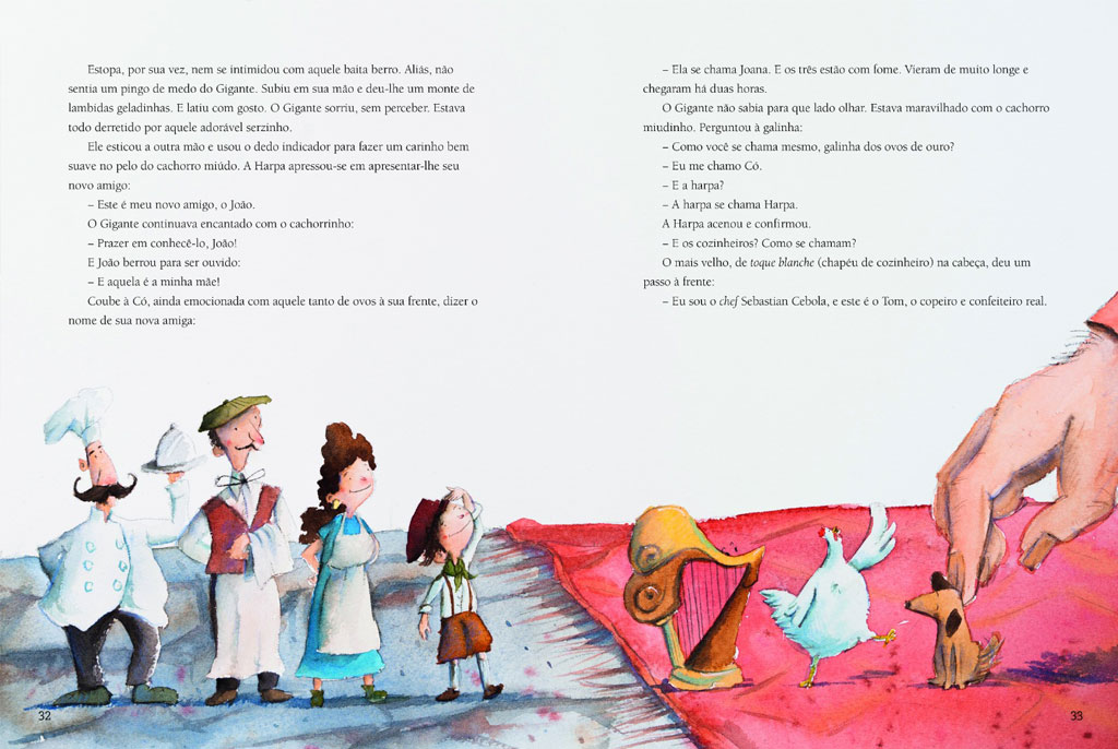 João conhecia a música tocada pela harpa e resolveu acompanhá-la com seus assobios, enquanto Estopa observava a grande altura da mesa. Daí, o cãozinho lembrou-se de que acabara de escalar um pé de feijão infinitamente mais alto, e, com a maior facilidade do mundo, subiu no pé da mesa e foi deitar-se ao lado da mão do Gigante.